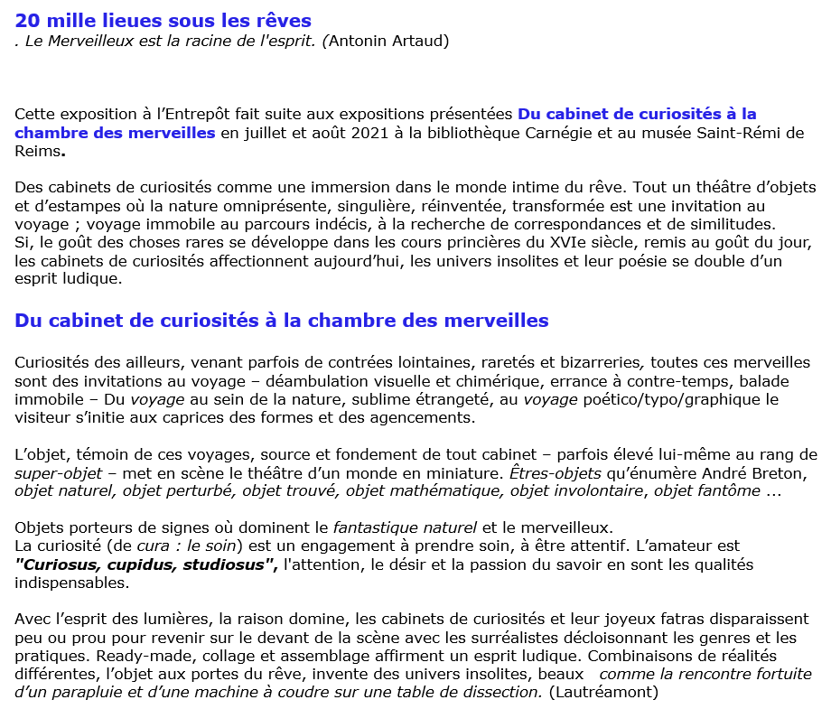 20000 LIEUES SOUS LES REVES 18, 19, 25 et 26 septembre 2021 EXPOSITION de CABINETS de CURIOSITES Cliquez sur l’icône ci-dessous pour voir le teaser de l’exposition réalisé par Jean-Michel ALLOUX En partenariat avec l’association ATELIER RECTO VERSO EXPOSITION IMMERSIVE Scénographie et mise en lumière originales et oniriques créées par Jean-Jacques FREMAUXAmbiance sonore de Fred ROCHETTE Marie-Christine BOURVEN Marie-Christine BOURVEN et Maud COURTEHOUX Sophie DROUOT Jeanne EDEL Marie-Hélène FERRASSON Marie-Odile GUY Odile IMBROSCIANO Sophie et Victor LEPETIT Jean-Louis MONTJOIE Virginie NIDEGGER Isabelle PETIT NUNES Marie-Claude PIETTE François SCHMIDT et Catherine STEVENOT Loraine WIBLE ZYPLOX RETOUR à l’ACCUEIL