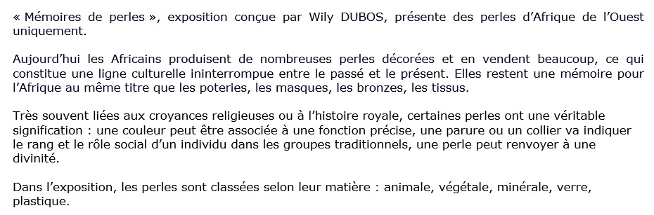 MEMOIRES de PERLES EXPOSITION de PERLES de l’AFRIQUE de l’OUEST A l’ENTREPOT 2, Chemin de la Scierie à SERZY et PRIN Les 4, 5 et 12 septembre 2021 de 14h00 à 19h00 Entrée libre Une exposition conçue par Wily DUBOS RETOUR à l’ACCUEIL