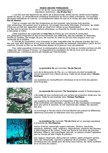 AU FIL DES ILES 2 Exposition de MARIE-HELENE FERRASSON au STUDIO PASTEL 6 rue de l’Ecu - 51100 - REIMS du 1 au 31 mars 2023 les lundi, mardi, jeudi et vendredi de 10 h à 18 h issue de l’exposition immersive présentée à SERZY et PRIN en 2022 Cliquez sur l’icône ci-dessous pour voir le teaser de présentation réalisé par Olivier CHAFFIOL EXPOSITION IMMERSIVE de GRAVURES Scénographie et mise en lumière originales de Jean-Jacques FREMAUXAmbiance sonore de Fred ROCHETTE Un film réalisé par Thierry CJAZKO et produit par NTC PROD présentant les différentes étapes de la gravure est diffusé en continu à titre pédagogique C’est un voyage vers cinq îles imaginaires qui est proposé, cela raconte les lectures, les recherches et la passion pour la gravure de Marie-Hélène FERRASSON. Ce voyage nous parle d’écologie, d’horizons, de reliefs, de curiosités. Ces cinq îles de fiction ont comme fil conducteur une géographie imaginaire et des environnements très différents mais toujours avec une recherche de la lumière. RETOUR ACCUEIL