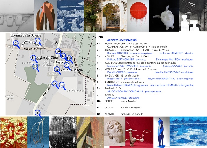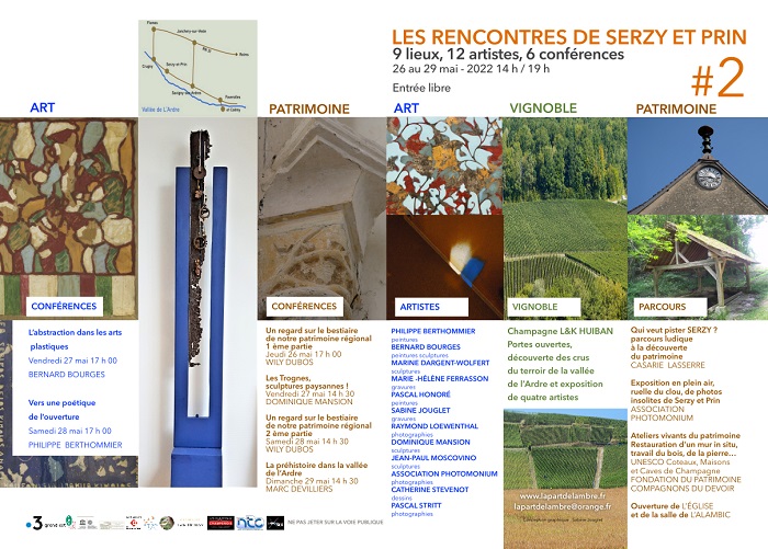 RETOUR sur les 26, 27, 28 et 29 mai 2022 LES RENCONTRES de SERZY et PRIN Cliquez sur l’icône ci-dessous pour voir le teaser des Rencontres de Serzy et Prin réalisé par Jean-Michel ALLOUX Dans un cadre préservé entre vignes et forêts, valoriser l’heureuse complémentarité entre une église romane, un beau village de pierres, des Ateliers Vivants du Patrimoine animés par la Fondation du Patrimoine et les Compagnons du Devoir, sept lieux d’exposition accueillant douze artistes contemporains et des conférences sur l’Art et le Patrimoine. Point Information - Catherine STEVENOT Bernard BOURGES - Dominique MANSION Philippe BERTHOMMIER - Sabine JOUGLET Marine DARGENT-WOLFERT - Pascal HONORE Jean-Paul MOSCOVINO - Raymond LOEWENTHAL Pascal STRITT - Marie-Hélène FERRASSON VIGNOBLE PORTES OUVERTES et découverte des CRUS du TERROIR au CHAMPAGNE L et K HUIBAN PATRIMOINE ATELIERS VIVANTS du PATRIMOINE RESTAURATION d’un MUR du XVIIème siècle IN SITU EXPOSITION de MAQUETTES de METIER EXPOSITION de PHOTOS AVANT/APRES de belles réalisations du Patrimoine "QUI VEUT PISTER SERZY ?" de CASARIE LASSERRE Parcours ludique à la découverte du Patrimoine EXPOSITION de plein-air, ruelle du Clou de photos insolites de Serzy et Prin de l’association PHOTOMONIUM > </sautAOuverture de l’EGLISE et découverte de la salle de l’ALAMBIC MARC DEVILLIERS Exposition de silex taillés et polis de la vallée de l’Ardre RECTO FLYER Pour imprimer le recto du flyer cliquez sur le lien ci-dessous http://lapartdelambre.fr/IMG/pdf/recto_flyer2.pdf VERSO FLYER Pour imprimer le verso du flyer cliquez sur le lien ci-dessous http://lapartdelambre.fr/IMG/pdf/verso_flyer2.pdf